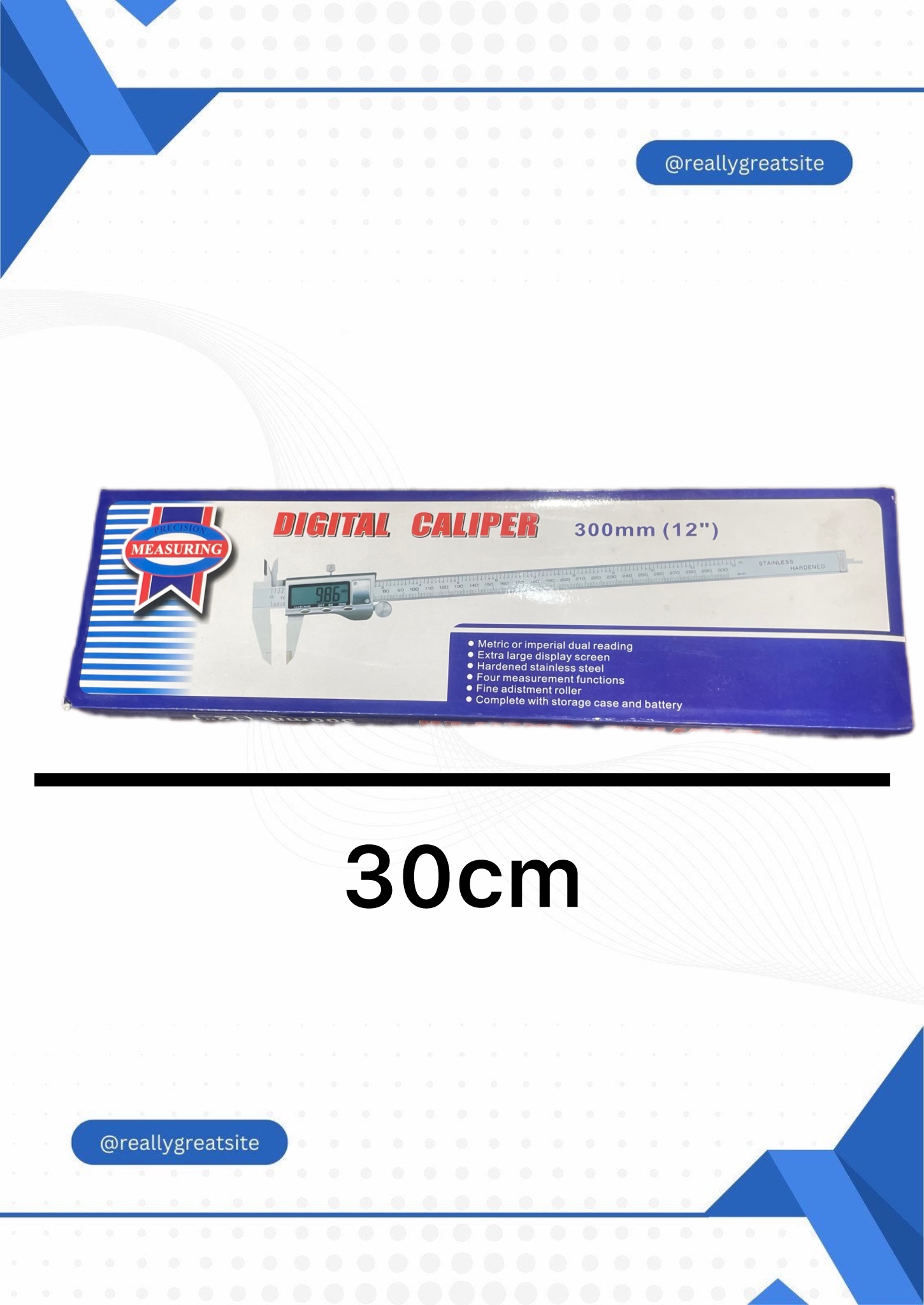 کولیس 30 سانت دیجیتال ابزاری برای اندازهگیری دقیق طول، قطر داخلی و خارجی و عمق اجسام است. این کولیس دارای نمایشگر دیجیتال است که اندازه را با دقت معمولاً تا ۰.۰۱ میلیمتر نشان میدهد. استفاده از آن سریع و آسان است و معمولاً از جنس استیل ضدزنگ ساخته میشود.